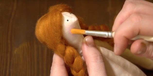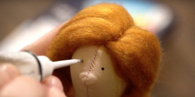 Для изготовления волос понадобится шерсть для валяния и специальная игла. Ещё причёску можно сделать из пряжи. Для глаз нужен чёрный контур по ткани или акриловая краска, а для щёк — розовые румяна, пастель или акриловая краска.