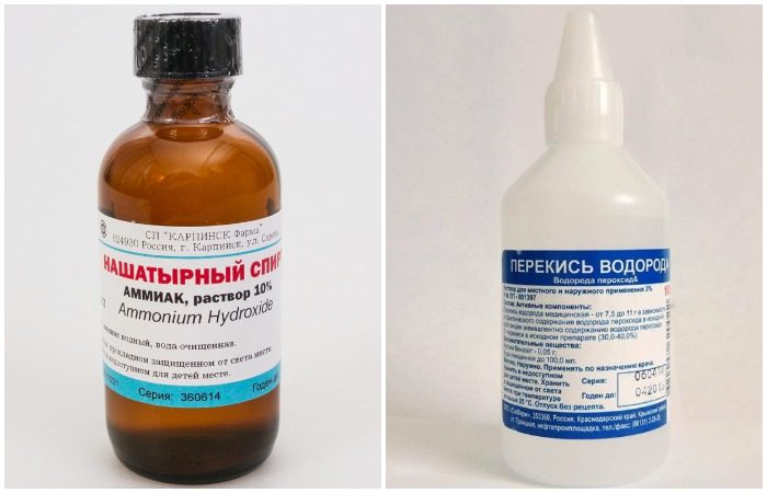 Для удаления пятен на белых вещах протрите загрязнение нашатырным спиртом. Предварительно подложите под слой одежды светлое полотенце, а после обработки оставьте вещь на 1 час и постирайте. Для деликатных изделий белого цвета аналогичным способом можно применить перекись водорода. В случае, когда пятно не поддается очищению, смешайте оба препарата в равных пропорциях и повторите вышеописанные манипуляции.