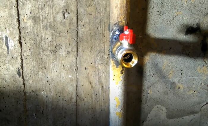 Перед началом работ необходимо зачистить трубу от краски в месте будущей установки шарового крана. Как только это будет сделано, берем сварочный аппарат и привариваем к трубе нашу резьбу. Далее на нее надевается фумлента или лен, а затем ставится сам шаровой кран. На этом первый и самый простой этап работ завершается.