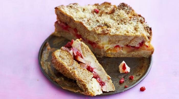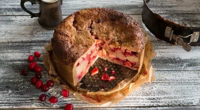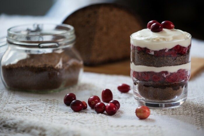 • На дно выложить равномерный слой хлеба, после — слой яблок, сверху клюкву (повторить);