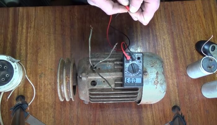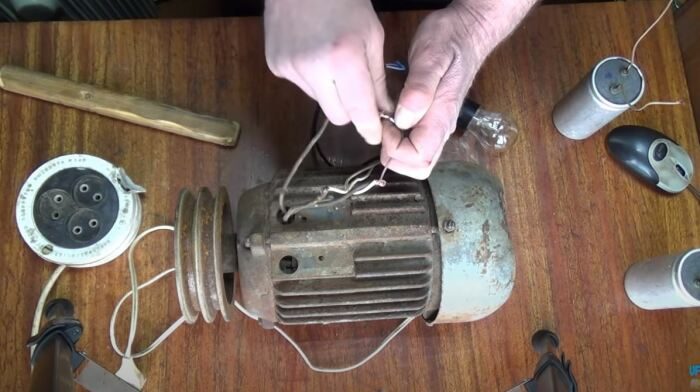 Далее к любому из двух оставшихся проводов необходимо будет подключить двужильный провод с вилкой. К оставшемуся проводу между тем подключается конденсатор, второй контакт которого подключается к любой из оставшихся скруток. В зависимости оттого, как именно был присоединен конденсатор (к фазе или к нулю), ротор двигателя будет по часовой или против часовой стрелки. Не забываем также установить кнопку пуска перед конденсатором. В качестве последнего можно применить обычную лампу накаливания.