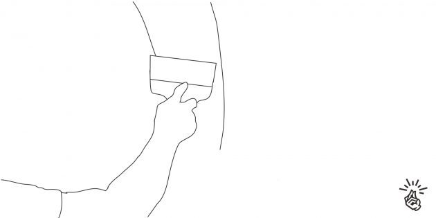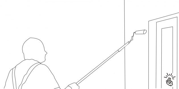 Первый: используя небольшую кисть, не спеша прокрасьте полосы шириной 5–7 см вдоль потолочных багетов, в углах, у плинтусов, а также вокруг радиаторов отопления, розеток и выключателей. Для защиты потолка можно заклеить лезвие шпателя малярной лентой и, прикладывая его в угол, спокойно красить кистью.