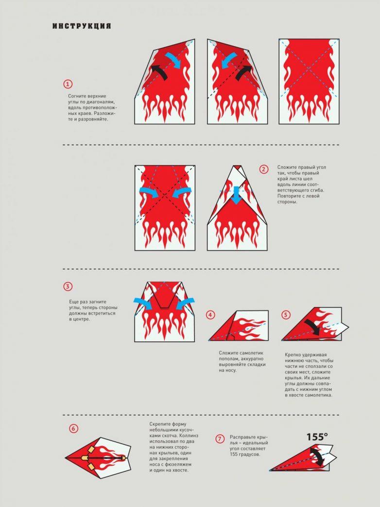К созданию своих бумажных самолетов Джон Коллинз подходит со скрупулезностью настоящего инженера. «Каждый бумажный самолетик — это небольшой научный эксперимент, — говорит он. — Вы делаете предположение о том, какая конструкция и какие «настройки» будут лучше, проводите опыт — бросок — и тут же получаете результаты и анализируете их».