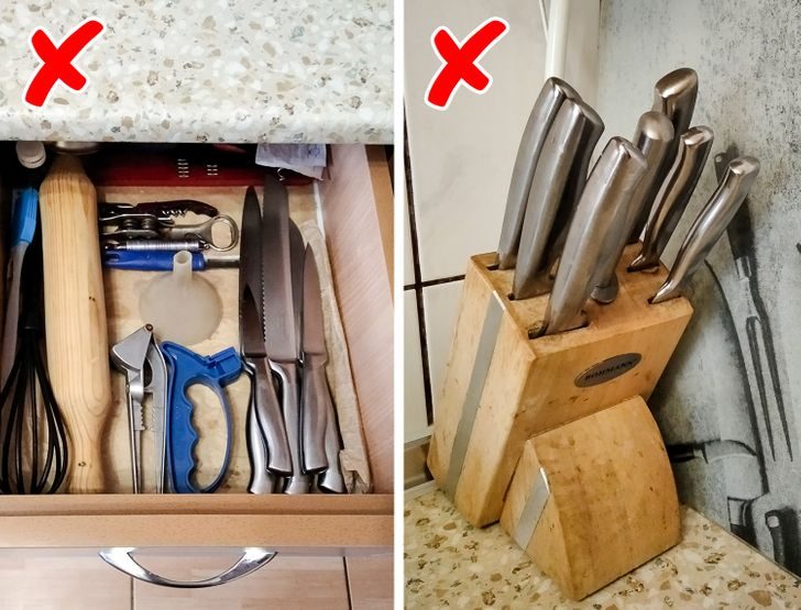 Специалисты советуют держать ножи на магнитных рейлингах или в гигиеничных пластиковых подставках. В крайнем случае можно использовать защитные чехлы.