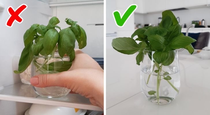 Чтобы базилик оставался свежим, обрежьте стебли и поместите его в стакан с водой, как цветы. Неплотно накройте стакан с зеленью полиэтиленовым пакетом и оставьте на столе. Некоторые травы, такие как петрушка и кинза, можно хранить так в холодильнике, но базилик лучшесохраняется свежим при комнатной температуре. В холодильнике его листья могут стать черными.