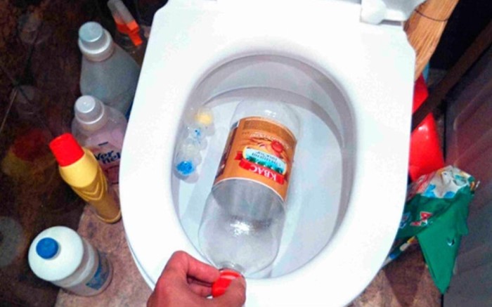 Во время поднимания бутылки внутри нее образовывается воздушная подушка. При опускании получается подобие гидроудара и накопленный воздух давит на воду, достигая точки засора. В результате пробка пробьется благодаря резким, ритмичным движениям, и жидкость начнет уходить. После успешного проведения спасательной операции заверните бутылку в плотный полиэтиленовый пакет и утилизируйте.