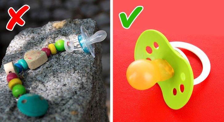 Тяжело представить малыша, который бы не пользовался пустышкой или соской. Однако при покупке этой вещи выбирайте варианты без длинных шнурков и ленточек. К сожалению, согласно статистике, существует риск получения травм и удушья ребенком. Поэтому отдавайте предпочтение стандартным вариантам соски с короткой ручкой.