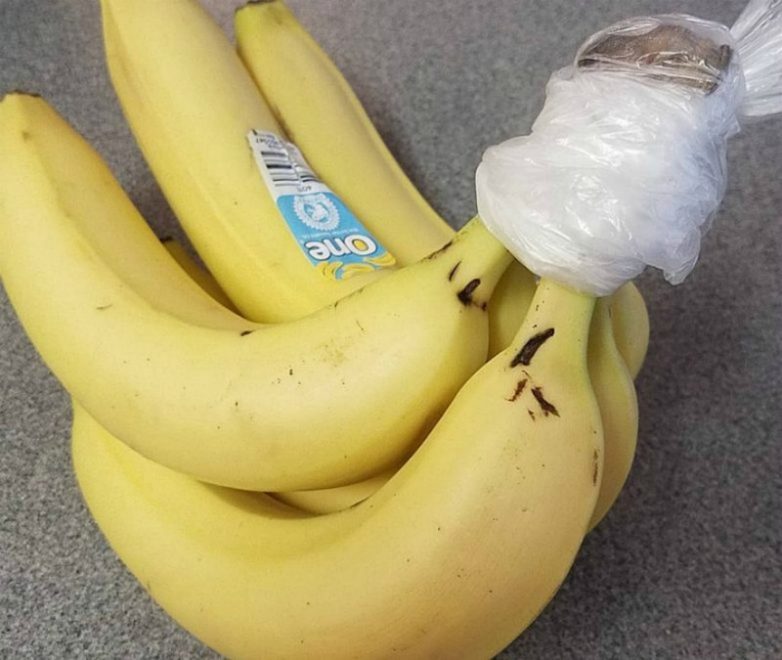 Бананы имеют свойство темнеть и быстро портится. Продлить им жизнь поможет пакет или пищевая пленка. Но не упаковывайте всю связку целиком, оберните только стебель.