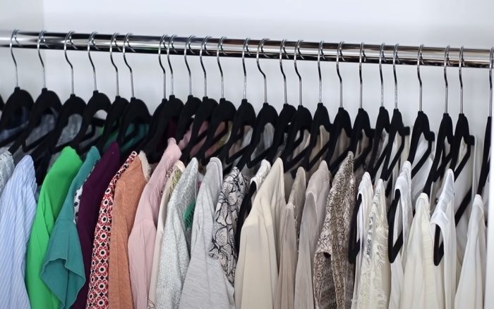 Следующий прием декорганайзинга – развешивание по цветам. Обычно вещи раскладывают по категориям, на этом организация хранения заканчивается. Если же подходить с точки зрения эстетики, то одежду следует развешивать, размещая рядом предметы одной цветовой гаммы и выстраивая их на штанге в порядке изменения тона: от темного к светлому. По этому же принципу раскладывают вещи и на полках шкафа, и в ящиках комода. Таким же образом можно размещать и продукты на кухне, например, крупы.