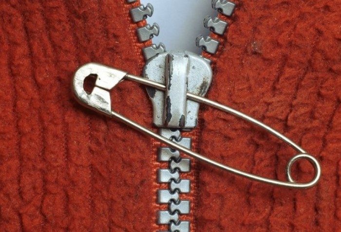 Лучшее решение — замена бегунка. Но если это случилось в наиболее неподходящий момент, придется найти альтернативу язычку. Подойдет металлическая скрепка, кольцо от брелока, булавка. Вставьте элемент в собачку и растегните-застегните изделие.