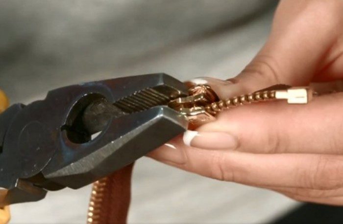 Для ремонта металлической змейки понадобятся схожие зубцы. Форма и размер должны быть идентичными, иначе ничего не выйдет. Отделите от старой молнии нужное количество зубцов. Вставьте их в поломанную змейку и зажмите плоскогубцами. Проверьте прочность фиксации и, если требуется, повторите манипуляции. Если зубцы не выпали, а лишь стали мешать прохождению собачки, раскройте змейку и положите ее на ровную поверхность. Далее легонько постучите молотком по зубцам, чтобы привести их в первоначальное состояние.