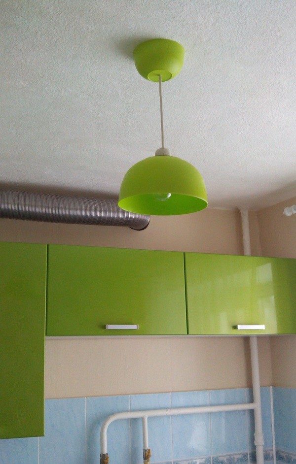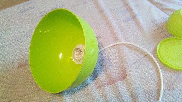 От автора: жена подала идею запилить люстру, когда мы в очередной раз прогуливались по «Мегастрою». Выбрали обыкновенные пластиковые миски под цвет гарнитура, купил метр провода, патрон.