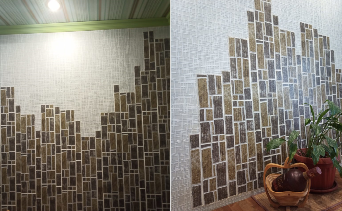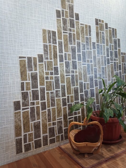 Любые интерьерные преобразования влекут за собой солидные финансовые затраты, и только от изобретательности владельцев зависит, насколько будут они ощутимы для собственного кармана. Так, например, креативная хозяйка, покопавшись в интернете, нашла интересный вариант оформления стены с помощью элитного декоративного камня. Поскольку непомерные затраты, которые пришлось бы понести семье не входили в планы женщины, она решила заменить дорогущий камень на самую дешевую напольную керамическую плитку, ее остатки после предыдущего ремонта, как раз попалась на глаза.