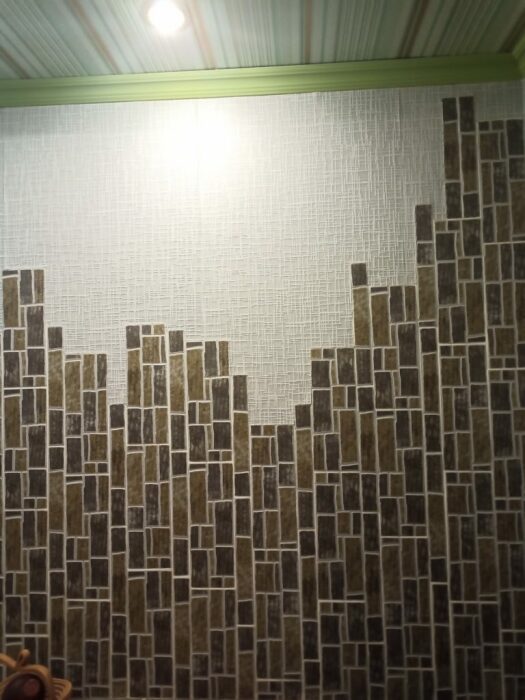 Перед тем, как начать наклеивать нужные «зубцы» очертаний замка на стену, рисунок оформили на полу и лишь потом поочередно перемещали каждый элемент на свое место. Но перед этим, как впоследствии оказалось, проделали массу ненужной и кропотливой работы. Изначально было решено укладывать полоски плитки вровень с обоями, чтобы рисунок стал ее естественным продолжением, ведь подобное декорирование выполняли впервые и не могли знать, что фактурный рисунок, в виде панно смотрится более оригинально. Да и с практической точки зрения проблем было бы намного меньше. А так пришлось делать углубление в стене, потом все неровности зашпаклевывать, чтобы плитка легла красиво и без изъянов.