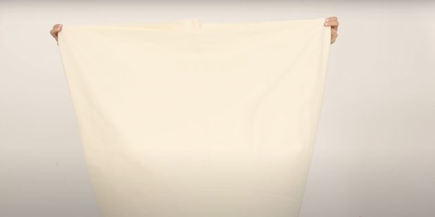 Возьмите бязь и сложите её пополам так, чтобы у вас получился прямоугольник размером 90 × 120 см. Прострочите по одной из коротких сторон фигуры и по длинной. Получится мешок.