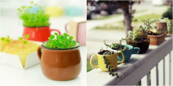 Зачем лишний раз тратиться на цветочные горшки? В чашечках зелень выглядит так мило.