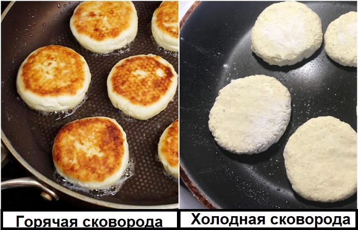 Перед тем, как приступать к непосредственной жарке сырников, необходимо хорошо разогреть сковороду вместе с маслом. Если положить тесто на холодную поверхность или налить слишком много растительного масла, сырники не успеют приобрести румяную хрустящую корочку и развалятся. Самым лучшим девайсом для приготовления десерта станет чугунная сковорода с толстым антипригарным дном, которое сможет обеспечить хрустящую корочку. А пышность и мягкость обеспечит использование крышки: положите сырники на сковороду, через пару минут переверните и накройте крышкой до готовности.