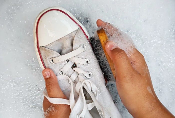 1. Если светлая обувь пожелтела или покрылась пятнами, перестирайте кроссовки с применением деликатного отбеливателя.