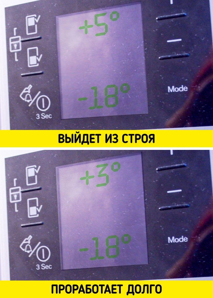 Идеальная температура, которая и продукты сохранит, и холодильнику не навредит, составляет +1… +3 °C. В морозилке поддерживайте температуру −18 °C. Так в ваших продуктах не зародится жизнь, а холодильник не придется часто размораживать, и он прослужит вам дольше. А еще это избавит от неприятных запахов. Если выкрутить значение на максимум, холодильник будет использовать все свои мощности и быстро придет в негодность.