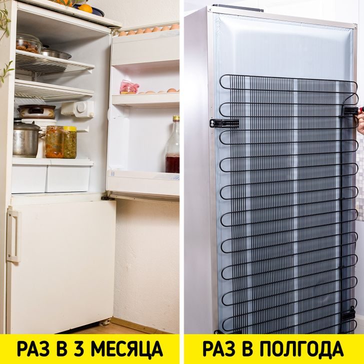 Чистить устройство советуют дважды в год с помощью обычного пылесоса. Раз в три месяца протирайте холодильник изнутри и снаружи. Это предотвратит появление неприятного запаха, плесени и болезнетворных микроорганизмов. Чтобы облегчить себе жизнь, еженедельно проводите ревизию продуктов, отправляя испортившиеся или просроченные в мусорное ведро.