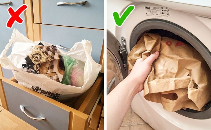 Что делать: холщовые изделия нужно стирать в машинке при высокой температуре. Пакеты из переработанного пластика мыть вручную в теплой мыльной воде, из нейлона — выворачивать наизнанку и стирать в деликатном режиме.