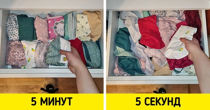 Тонкое кружевное белье легко рвется, поэтому его лучше аккуратно сворачивать и хранить отдельно от других вещей, а вот обычные трусы можно просто бросать в ящик.