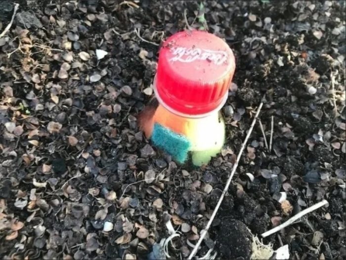 Изготовление начинается с того, что в пластиковой бутылке делаются отверстия в произвольном порядке. Внутри бутылка наполняется нарезанными кубиками губки. Затем нужно просто закопать изобретение в землю рядом с огородной культурой. При засушливой погоде в бутылку наливается вода, которая будет постепенно уходить в почву и подпитывать корни. Если пойдет дождь, то пустая бутылка поможет избавить корни от загнивания и переувлажнения. Для того чтобы система работала, губки нужно время от времени менять.