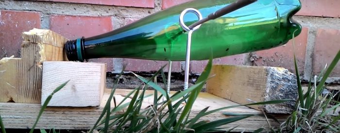 Посредством дополнительного кусочка проволоки внутри бутылки фиксируется приманка. Рядом с горлышком бутылки устанавливается деревянный брусок, находящийся немного ниже отверстия. По нему мышь может попасть внутрь бутылки, но когда та наклонится, вход будет заблокирован бруском.