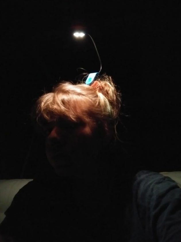 Диодная лампа для чтения легко заменит налобный фонарик, особенно если у вас длинные волосы.