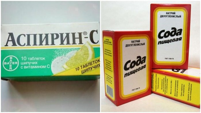 Требуется именно эти шипучки, которые при растворении в воде бурлят и издают шипящие звуки. Купить их можно практически во всех аптеках по невысокой цене. В общем потребуется две-три столовых ложки соды и две таблетки аспирина.