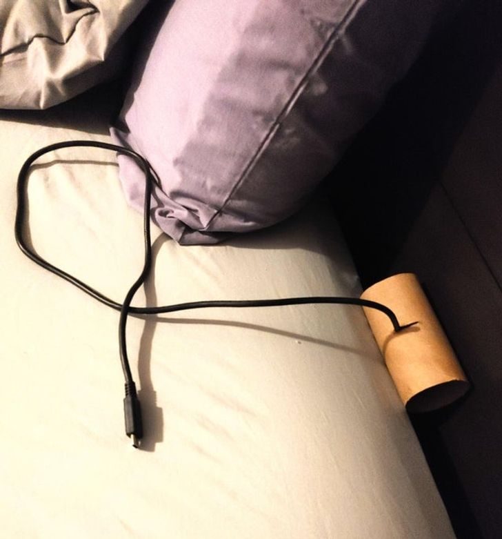 «Если ваша зарядка часто падает за кровать, можно вот так использовать втулку из-под туалетной бумаги»