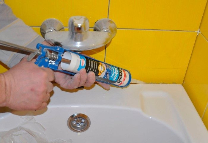 Предварительно обезжирьте рабочую поверхность, а затем наносите герметик. Непрерывной линией пройдитесь средством по стыку. Чтобы выровнять силиконо-акриловый материал, воспользуйтесь шпателем. Оставьте вещество до полного высыхания, а остатки сотрите побыстрее, иначе останутся трудновыводимые загрязнения. Герметик заблокирует проникновение неприятных ароматов из канализации.