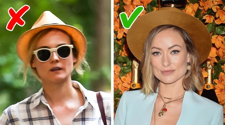 Высокие шляпы или объемный декор на них сделает лицо слишком длинным, поэтому их лучше оставить на полке. Тот же эффект дадут не в меру узкие поля.