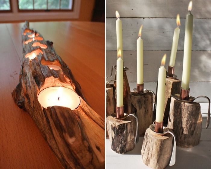 Кусочки дерева более крупного размера отлично подойдут для изготовления канделябров. Например, можно соединить несколько веток в причудливой композиции. Самобытно и интересно будет смотреться канделябр из куска коряги как причудливой природной формы, так и выточенный, с четкими очертаниями. А чтобы свечи не упали, в древесине проделывают неглубокие выемки соответствующего диаметра.