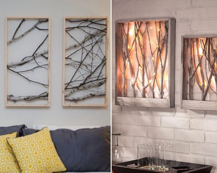 Украшение для стены можно также собрать из кусочков веток, склеивая компоненты в причудливое полотно. Вариаций дизайна много, все зависит от фантазии мастера. Если же к панно добавить еще светодиоды, получится оригинальный элемент декора с подсветкой в вечернее время суток.