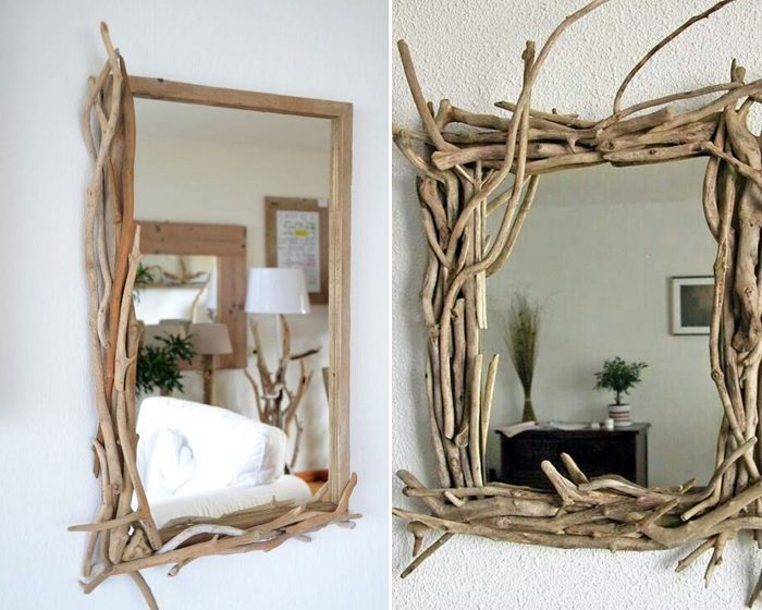 Оформление зеркал выполняется по аналогичной технологии. Можно декорировать уже имеющуюся оправу, полностью оклеив ветками, или вырезать новую раму из ствола или коряги. Но в этом случае древесина должна быть крепкой, без следов трухлявости.