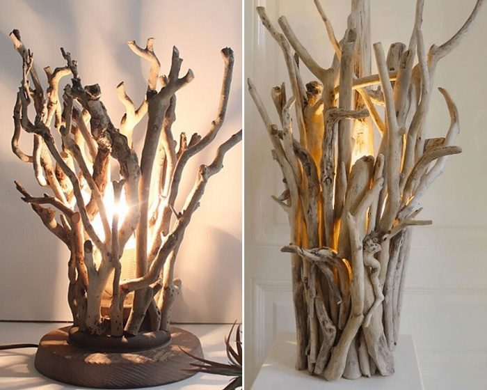 Из веток и сучьев можно сделать шикарные светильники любого типа: люстры, бра, торшеры. Они смотрятся невероятно красиво и создают уютную атмосферу в доме. Вариаций таких конструкций множество. Они могут быть массивными, когда основанием служит мощная коряга или легкими, из более тонких сучьев, сгруппированных в одну композицию. Очень интересно смотрятся варианты с плетением из ветвей, но это потребует кропотливой работы.