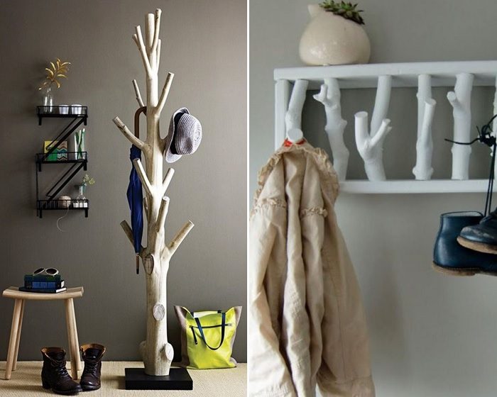 Интересным украшением прихожей станут вешалки из веток. Это могут быть кусочки материала, прикрепленные к дощечке в качестве крючков или несколько сучьев, заключенных в рамку.