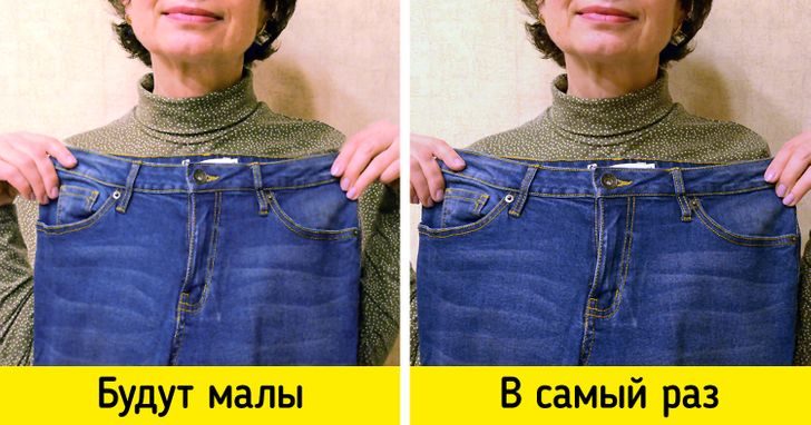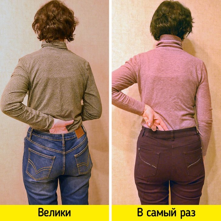 Чтобы узнать, подходят ли джинсы по размеру, совсем необязательно отстаивать очередь в примерочную. Достаточно застегнуть их, взять за пояс и приложить к талии от пупка до линии позвоночника. Если джинсы полностью покрывают это расстояние, значит, это ваш размер. Способ работает для большинства фигур, но не является универсальным, поэтому нужно делать поправку на индивидуальные особенности.