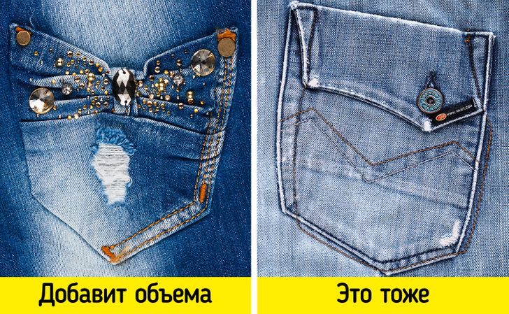 Декор задних карманов играет важную роль. Если вы являетесь обладательницей пышных форм и не хотите лишний раз их подчеркивать, то о вышивке, клапанах и других деталях на задних карманах лучше забыть. Напротив, если вам кажется, что объема недостаточно, эти элементы добавят его в два счета.