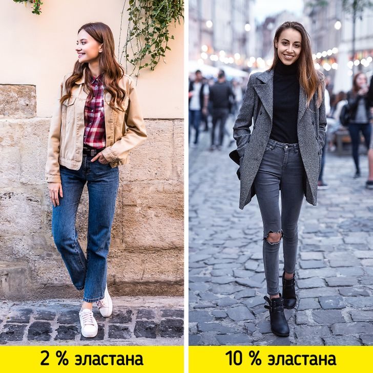 Для классических джинсов допустимое значение составляет 2–3 %, а для более обтягивающих, например скинни, — до 10 % эластана или лайкры в составе. Иначе они могут вытянуться в коленях и провиснуть на уровне бедер. В этом случае даже стирка не вернет штанам былую форму.