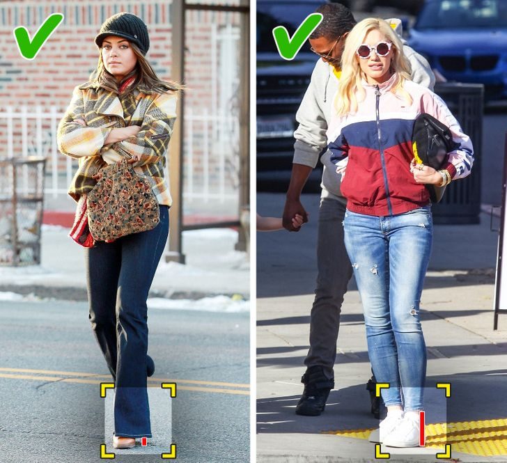 Чтобы точно угадать с джинсами и не жалеть о потраченных деньгах, примеряйте новую пару с обувью, с которой собираетесь ее носить. Так вы сможете понять, насколько открыты каблук и носок, оценить образ в целом и длину штанин. Кстати, последняя зависит от фасона. Например, брюки клеш обычно достаточно длинные: расстояние от пола до края штанины должно быть около 2 см. А скинни должны доходить до щиколотки.