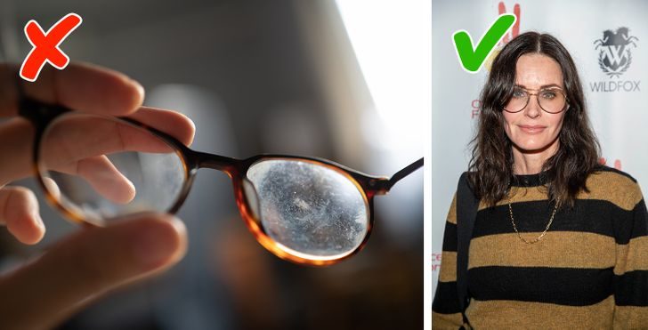 Эффект от стильной оправы запросто испортят грязные линзы. Всегда держите под рукой салфетку из микрофибры и периодически протирайте очки. Если на стеклах появились сильные царапины, то лучше их заменить.