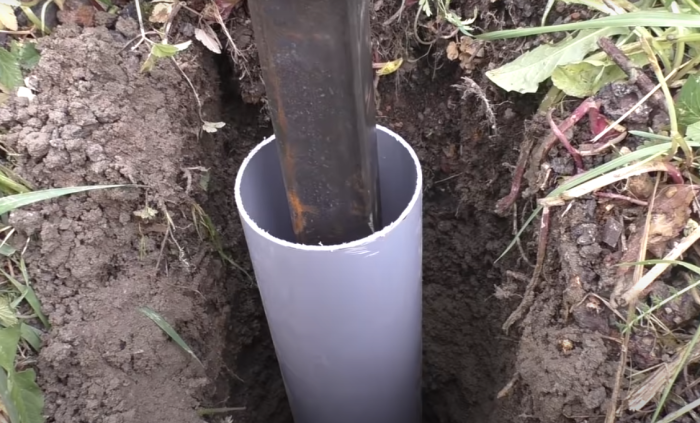Чтобы зимой столб не выдавливало, важно бетонирование осуществлять 2-мя диаметрами. Задаются они буром (диаметр внизу 18 сантиметров) и трубы ПВХ (диаметр вверху 11 см).
