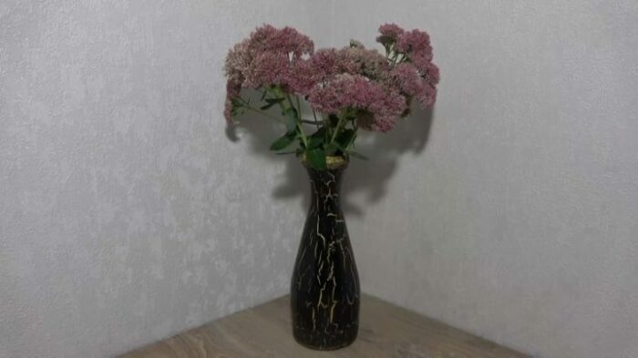 Теперь на бутылку наносится строительный клей ПВА. Его надо просушить посредством фена, чтобы на стекле образовалась пленка. Затем на эту пленку наносим черную акриловую краску и тоже сушим феном. Это спровоцирует необычный эффект: верхний слой черной краски будет трескаться, а в прожилках выступит золотистая краска. На этой стадии ваза практически готова: ее нужно покрыть универсальным лаком и дать высохнуть.