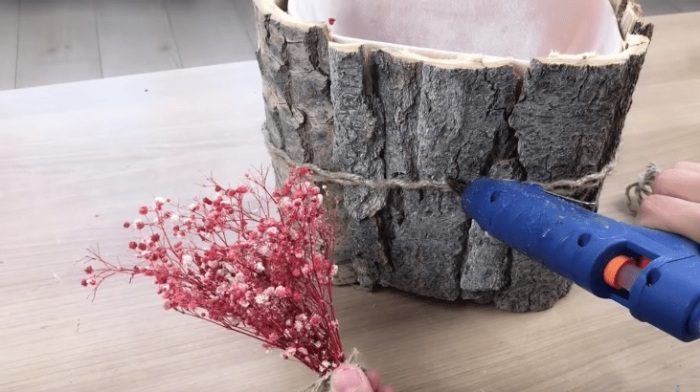 Сначала подготавливается кора, которая по своей длине и размерам должна соответствовать пластиковому ведру или корзине, подлежащим декорированию. При необходимости кору нужно промыть и просушить. Внутри будущая эко-корзинка выстилается любым текстильным материалом по вкусу. Для его закрепления используется горячий клей из пистолета. Снаружи корзина обклеивается корой дерева, ее нужно обильно смазывать клеем, чтобы хорошо держалась. Размещать ее проще всего вертикально. Дополнительно изделие можно украсить джутовой веревкой, цветами, шишками, желудями или другими природными элементами.