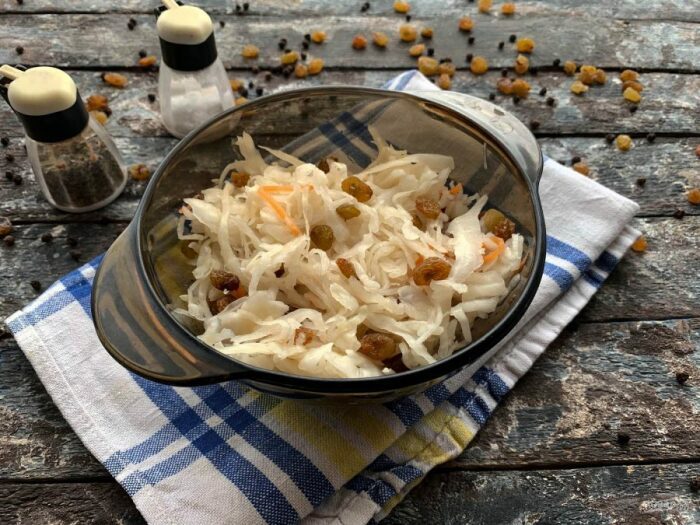 И ещё один оригинальный рецепт квашеной капусты, а именно – с изюмом. Столь необычное сочетание ингредиентов в конечном итоге порадует вас потрясающим вкусом.