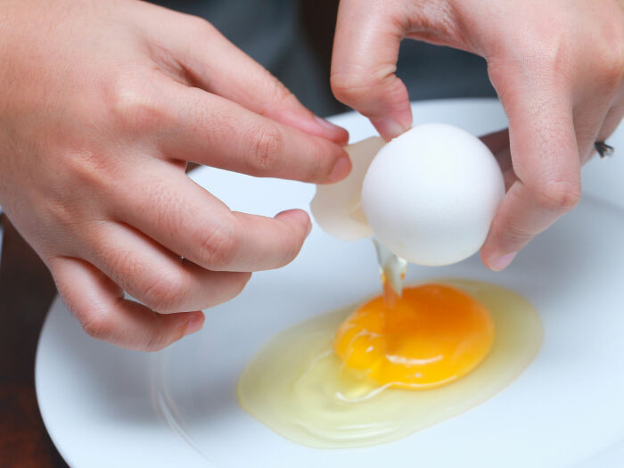 Большое значение имеет, где и как их разбивают. Нет значения, в каком блюде яйца будут участвовать, в тесте для блинов или торта, или яичнице, разбивать их сначала нужно не прямо в основную емкость с другими ингредиентами, а отдельно. Тем более не стоит разбивать скорлупу о край емкости, в которую они будут выливаться. Совершая такую ошибку, можно даже не заметить, как мелкие кусочки и осколки скорлупы попадают в еду. Правильные действия при готовке: разбить яйцо в отдельную миску, аккуратно постучав перед этим им о стенку кухонной стойки, пока оно не треснет. Затем двумя руками отделить две половинки яичной скорлупы над миской.