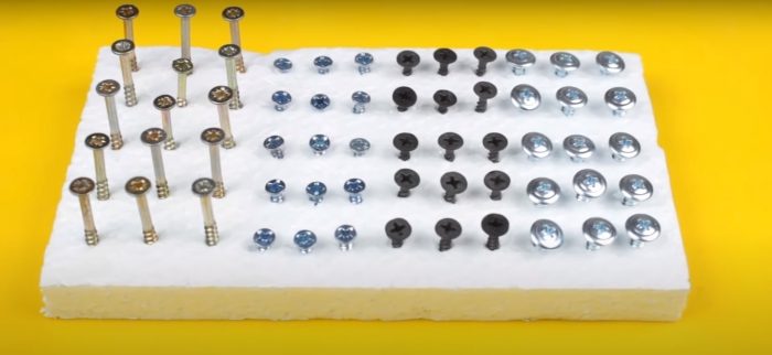Гвозди, шурупы, винты, саморезы часто лежат в одной общей коробке, путаются и потом с трудом находятся в нужный момент. Чтобы оптимизировать работу с ними, можно обеспечить простой и доступный органайзер. Для этого нужно всего лишь подготовить небольшой квадрат пенопласта и в него последовательно углубить все мелочи для закрепления.