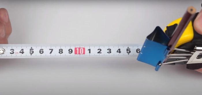 Канцелярским зажимом нужно зафиксировать карандаш ближе к его грифелю. После этого зажимы вставляются в прищепку, которая располагается на одной из сторон рулетки. Таким образом, карандаш практически вплотную прилегает к развернутой ленте рулетки, и им можно будет делать отметки на необходимой длине. Всего одно движение и никаких смещений.
